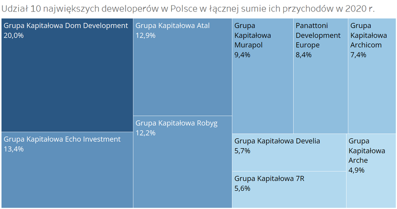 Suma przychodów ze sprzedaży za 2020 r. dziesięciu największych firm deweloperskich w naszym kraju wyniosła 9,1 mld zł.