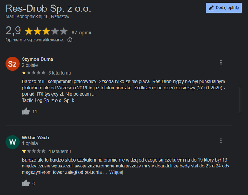 Opinie (oraz średnia ocen) dotyczące wymienionego wyżej Res-Drobu wskazują, że firma już kilka lat temu miała problem z dochowaniem terminowości spłaty swoich zobowiązań.