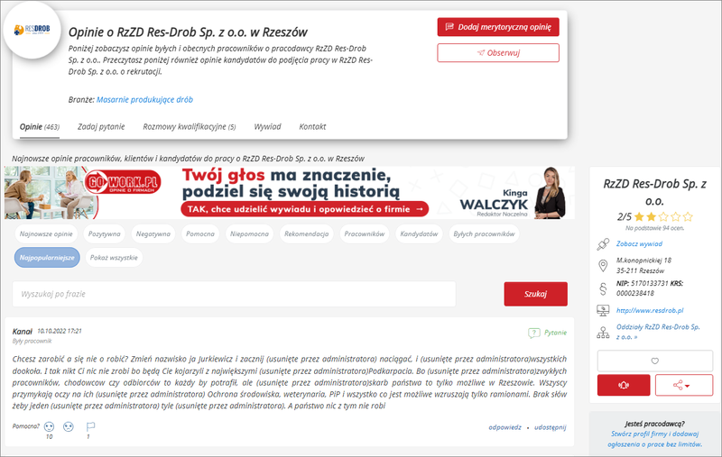 Treść ogłoszeń na temat Res-Drobu, które można znaleźć w KRZ dobitnie świadczy o tym, czego mogliśmy się dowiedzieć z komentarzy użytkowników Google i GoWork.