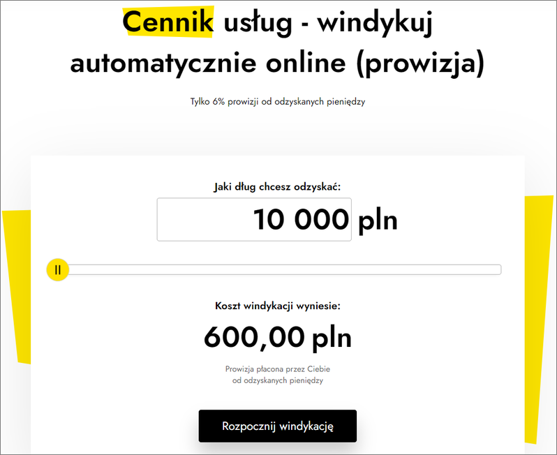 Przykładowo – prowizja firmy oferującej windykację online Vindicat.pl wynosi 6% wartości całego długu, jeśli wierzyciel zdecyduje się na tę formę usługi.
