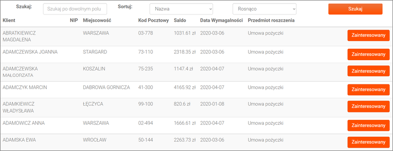 Tak wygląda widok giełdy długów na stronie firmy Vindix.pl: