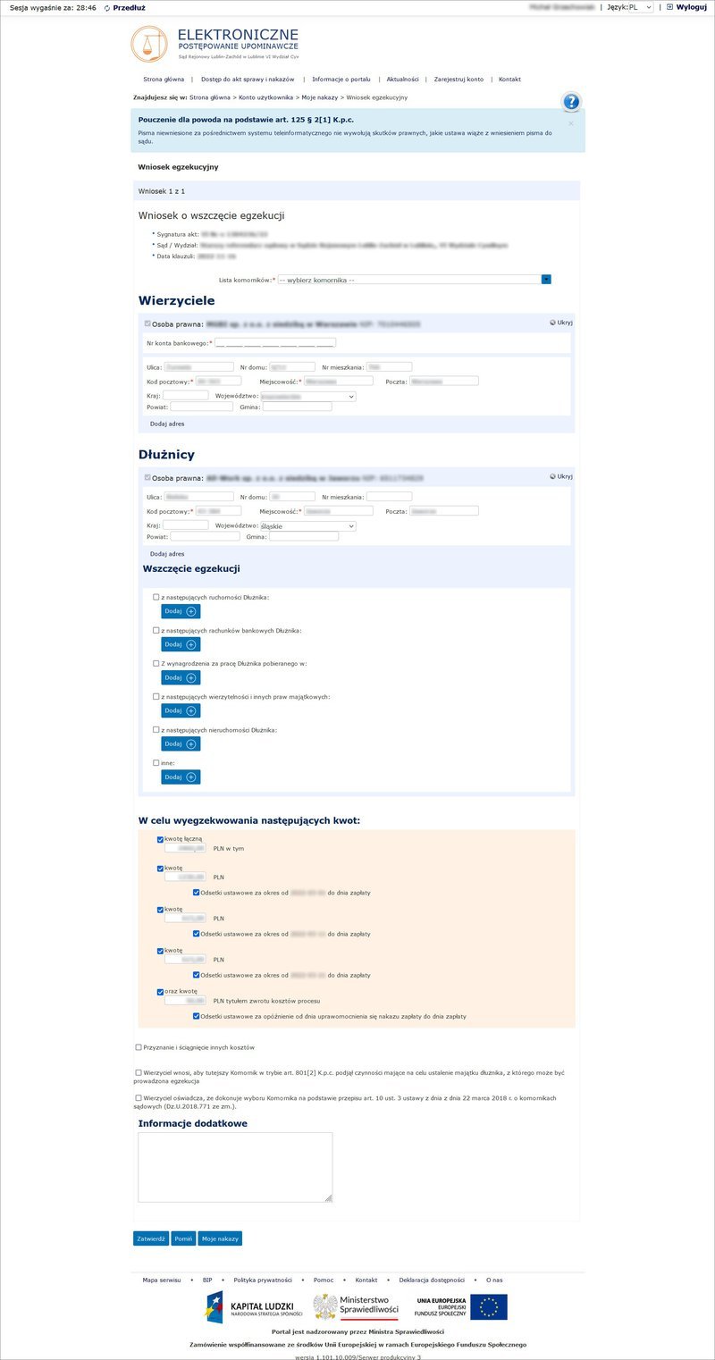 Po wyborze komornika przystępujemy do wypełnienia danych wierzyciela. Oprócz standardowych danych osobowych należy też wskazać konto bankowe, na które komornik przeleje pieniądze uzyskane od dłużnika. Należy też podać dane dłużnika.