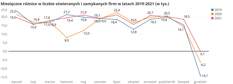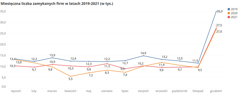 Dane za 2021 r. są porównywalne z tymi za 2019 r. Widoczne jest zwiększenie liczby zamykanych firm w marcu (10,9 tys.) i w czerwcu (11,3 tys.). W kolejnych miesiącach poza grudniem liczba przedsiębiorców kończących działalność utrzymywała się na podobnym poziomie, bez wyraźnych wzrostów i spadków.