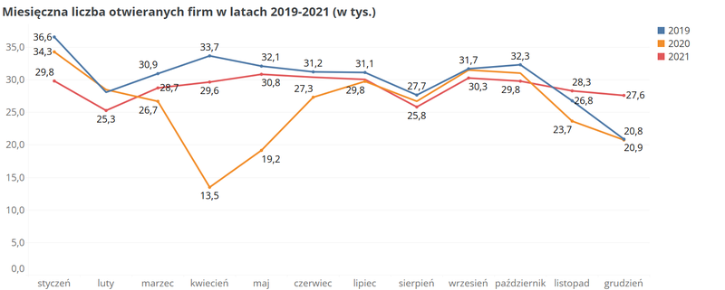 Dane za 2021 r. nie odbiegają znacząco od danych sprzed dwóch lat. Zauważalne odchylenie w dół wystąpiło w pierwszym kwartale, ale już w kolejnych miesiącach wartości miesięcznej liczby nowo rejestrowanych firm były zbliżone do wartości z 2019 r. Wyjątkiem był ostatni miesiąc w roku, kiedy to liczba rejestracji nowych firm okazała się o 30% wyższa niż w latach poprzedzających.