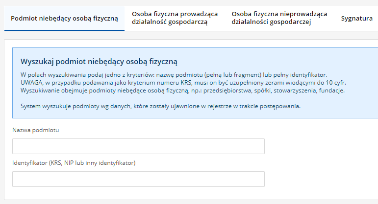 Podmiot niebędący osobą fizyczną (np. spółkę z o.o.) można wyszukać na podstawie jego nazwy, numeru NIP lub KRS. Przy wyszukiwaniu osoby fizycznej powinniśmy natomiast wpisać w wyszukiwarce jej imię i nazwisko lub numer PESEL albo też firmę i numer NIP, jeśli poszukujemy osoby prowadzącej działalność gospodarczą. Po odnalezieniu właściwego postępowania możemy przejrzeć wszystkie obwieszczenia opublikowane dotychczas w danej sprawie.