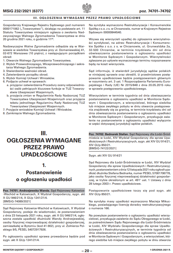 Źródło: Monitor Sądowy i Gospodarczy nr 232/2021 z 1 grudnia 2021 r.