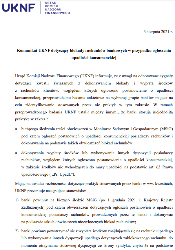 Mając na uwadze niejednolite praktyki stosowane w tym zakresie, 3 sierpnia 2021 r. Urząd Komisji Nadzoru Finansowego (UKNF) wydał rekomendację, zgodnie z którą banki, oddziały instytucji kredytowych, a także spółdzielcze kasy oszczędnościowo-kredytowe, powinny na bieżąco śledzić Monitor Sądowy i Gospodarczy oraz Krajowy Rejestr Zadłużonych pod kątem obwieszczeń dotyczących ogłoszenia upadłości posiadaczy rachunków prowadzonych przez te instytucje, a także dokonywać na podstawie takich obwieszczeń niezwłocznych blokad rachunków.