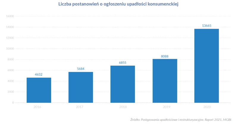 W 2020 r. polskie sądy orzekły niewypłacalność ponad 13,7 tys. osób, co oznacza wzrost o 69% w stosunku do roku poprzedniego. To bezprecedensowa zmiana, jakiej nie obserwowaliśmy wcześniej poza 2015 i 2016 rokiem, czyli pierwszymi dwoma latami obowiązywania zliberalizowanej procedury upadłościowej.