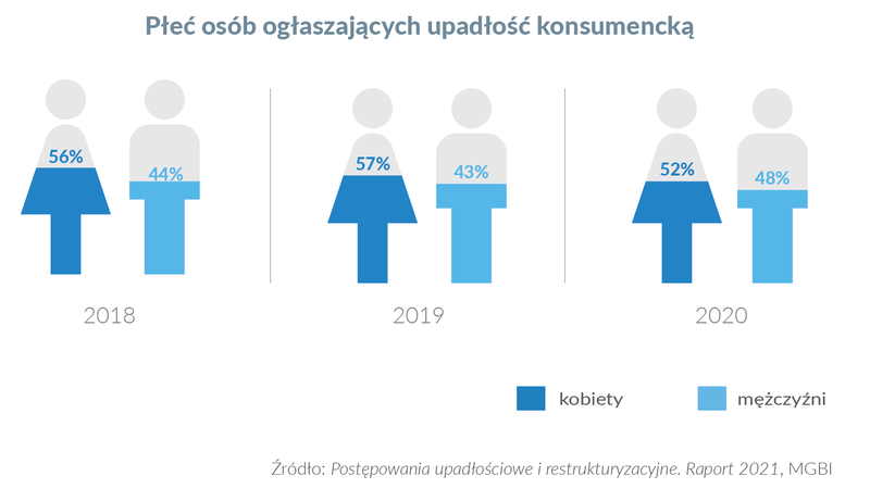 Porównując do ogólnej struktury wiekowej polskiego społeczeństwa można dostrzec, że grupa Polaków w wieku od 34 do 44 lat statystycznie częściej korzysta z procedury upadłościowej, niż wynikałoby to z ich odsetka w populacji.