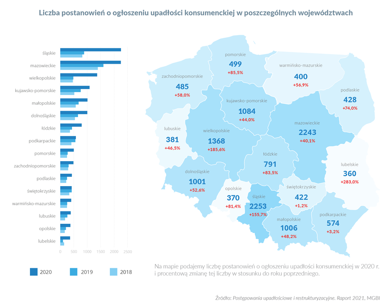 Sądy upadłościowe wydały w okresie od stycznia do grudnia 2020 r. o 40-80% więcej postanowień niż rok wcześniej. Wyjątkami okazały się dwa województwa: świętokrzyskie oraz podkarpackie. W tych regionach liczba ogłoszonych niewypłacalności konsumenckich na przestrzeni ostatnich dwóch lat prawie się nie zmieniła.