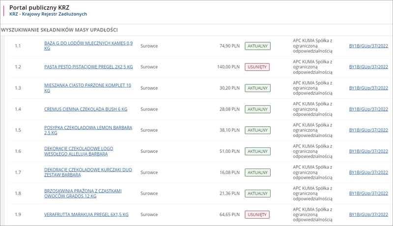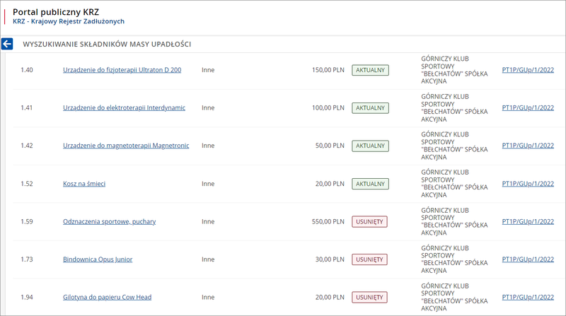 Status danego składnika określony jako „aktualny” lub „usunięty” informuje nas czy dany składnik masy upadłości nie został jeszcze zlikwidowany w toku postępowania upadłościowego. Co ważne, likwidacja może nastąpić poprzez sprzedaż danego składnika, ale też np. wyłączenie z masy upadłości w sytuacjach wskazanych w prawie upadłościowym.