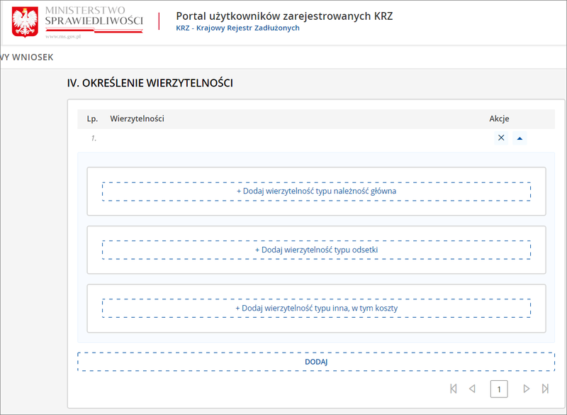 Aby zgłosić wierzytelność, należy z katalogu wniosków wybrać odpowiedni, a następnie przejść przez cały proces, uzupełniając po drodze niezbędne rubryki.