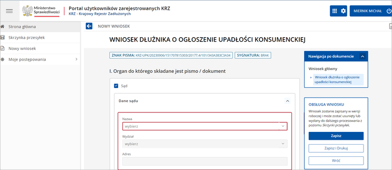 Po zalogowaniu się do KRZ użytkownik uzyskuje możliwość wyszukiwania wzorów wszystkich niezbędnych dokumentów, które są potrzebne w toku postępowań upadłościowych i restrukturyzacyjnych prowadzonych za pomocą systemu.