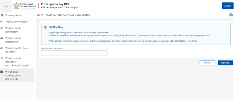 Krajowy Rejestr Zadłużonych umożliwia weryfikację pochodzących z niego dokumentów. Aby jej dokonać, należy wprowadzić identyfikator dokumentu – system sprawdzi jego istnienie i umożliwi pobranie jego oryginalnej treści.