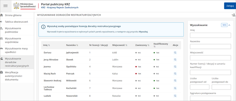 Kolejną wartą odnotowania funkcją KRZ jest możliwość wyszukiwania doradców restrukturyzacyjnych.