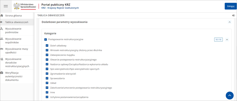 Wszystkie wymienione powyżej funkcje KRZ są dostępne dla użytkowników niezalogowanych. Po zalogowaniu do systemu przed użytkownikiem otwierają się nowe możliwości związane z prowadzeniem postępowań upadłościowych i restrukturyzacyjnych.