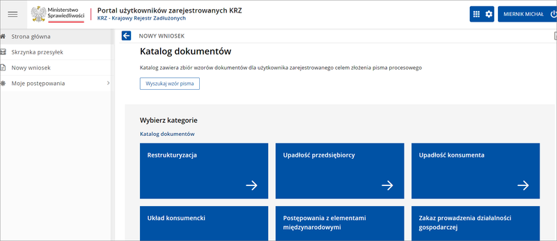 Katalog wniosków staje się wówczas dostępny z poziomu strony głównej serwisu. Dokumenty są podzielone na kategorie (Restrukturyzacja, Upadłość przedsiębiorcy, Upadłość firmy itd.), ale możliwe jest również ich ręczne wyszukiwanie.