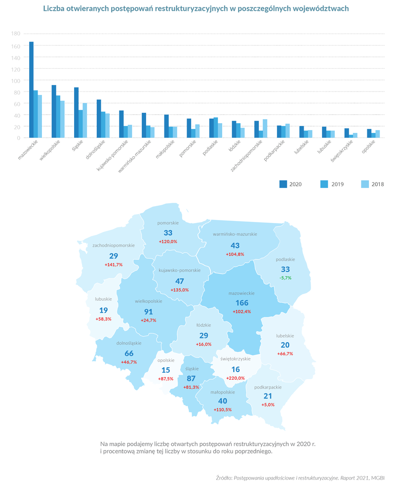 Pomimo wzrostu ogólnej liczby spraw restrukturyzacyjnych w 2020 r., nie wszystkie regiony podtrzymały równe tempo zmian. Liczba przedsiębiorstw poddanych restrukturyzacji w wartościach bezwzględnych zwiększyła się przede wszystkim w trzech województwach: mazowieckim, śląskim i kujawsko-pomorskim. W ujęciu procentowym więcej spraw tego rodzaju prowadziły też sądy w świętokrzyskim, zachodniopomorskim, pomorskim oraz małopolskim.