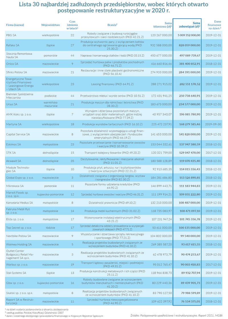 Poniżej publikujemy pełną listę 30 najbardziej zadłużonych przedsiębiorstw, które rozpoczęły restrukturyzację w 2020 r.
