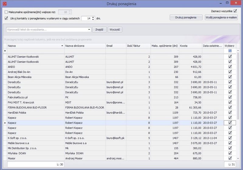 - generowanie ponagleń (wezwań do zapłaty) i zbiorcze wysyłanie ich przy pomocy elektronicznej do wszystkich dłużników