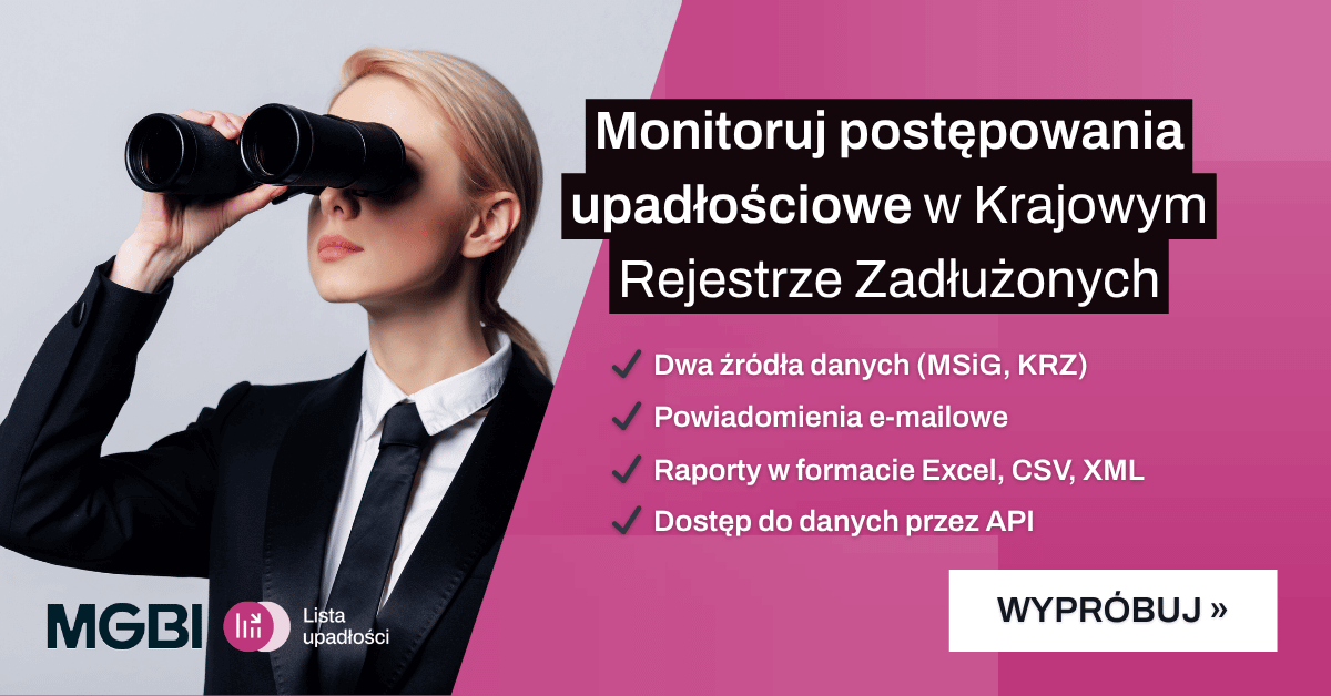 Oferowana w ramach tej usługi baza danych zawiera ustrukturyzowaną treść ogłoszeń publikowanych w Krajowym Rejestrze Zadłużonych (KRZ) oraz Monitorze Sądowym i Gospodarczym (MSiG) wzbogaconą o informacje pochodzące z publicznych rejestrów działalności gospodarczej (KRS, CEIDG, REGON).